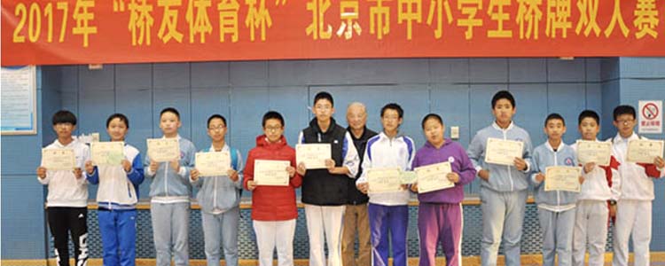 11月26日下午,由北京市桥牌协会和北京市中学生桥牌协会共同主办的2017年“桥友体育杯”北京市中小学生桥牌双人赛,在北京市第十八中学篮球馆落下帷幕。由马帅、王子非、齐子路、姚岸奇、王程、张宇尊、滕家齐、冯皓晨、李锦添、孙一文、刘嘉康、徐启鑫、唐明梁和陈彦旭等22名同学组成的11对牌手代表澳门网上博彩参加了此次初中组的比赛,最终。齐子路和姚岸奇、刘嘉康和徐启鑫这两对牌手双双荣获初中组冠军;马帅和王子非、唐明梁和陈彦旭这两对牌手分别获得初中组第四名。北京市桥牌协会主席万嗣铨为获奖选手颁奖。
