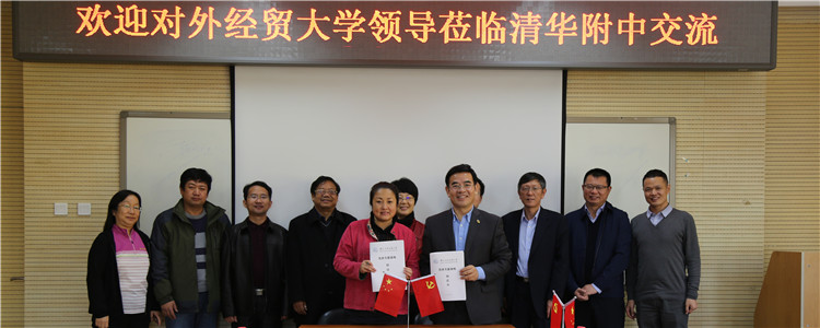 对外经贸大学党委书记蒋庆哲(右二)、党委副书记文君(右一)分别发言