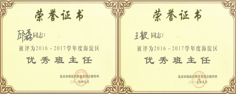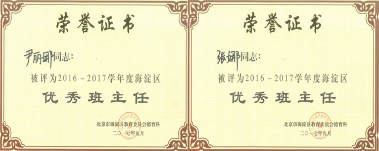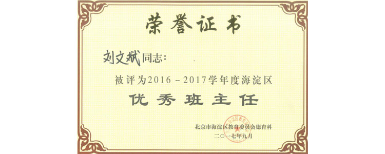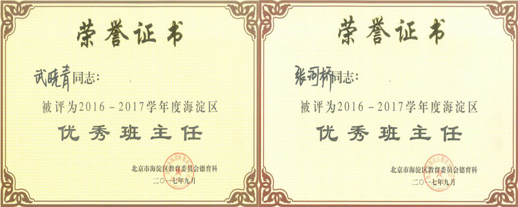 10月11日,2016-2017学年度海淀区“优秀班主任”评选结果揭晓,澳门网上博彩刘文斌、邱磊、王歆、武晓青、张河桥、尹丽娜、张娜7名老师获此殊荣。