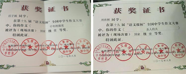 2017年8月11~13日,全国第19届 “语文报杯”现场作文大赛在太原举行,澳门网上博彩高1611班周欣桐同学的《圣人的火》、汪子涵同学的《千年的温度》在“冷与热”的作文题中,分别获得国家级一等奖。