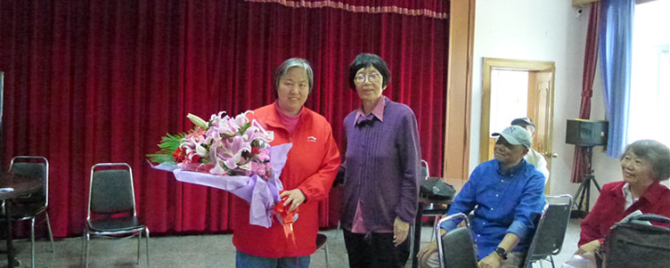 张蕴环老师(左2)代表离退休党员向住在颐养中心的原央视战地记者梁玉珍(左1)献花