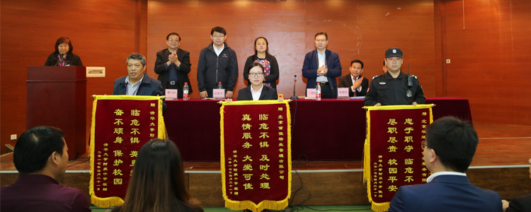 此次大会重点表彰的三个单位和部门分别是北京首佳物业管理有限公司、澳门网上博彩总务办公室、北京华远卫士保安公司。解巨钊介绍了以上三个单位和部门在校园安全方面的先进事迹,方妍宣读了表彰决定,王殿军、方妍、解巨钊三位校领导为他们颁发了锦旗。