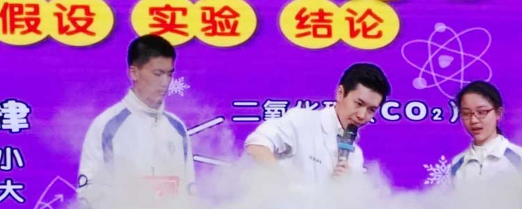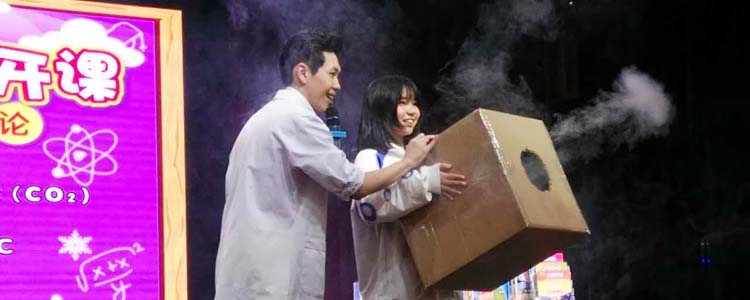 徐哲伟老师用幽默的语言、惊险刺激的实验,再现了生活中常见的现象,并对其中蕴含的物理知识进行了科普。首先,徐老师以“回旋竹蜻蜓”为奖品,邀请学生上台互动,他诙谐的语言、夸张的表情赢得全场欢笑连连,迅速拉近了与同学们之间的距离。而当“空气炮”凌空射出时,同学们欢乐的表情上更添了一份震惊与欣赏。趁热打铁,许老师接下来又邀请两名同学参与到“气流投篮”的活动中,感受流体带来的震撼。当气球在“看不见的手”的操控下冲向观众席时,同学们的热情再一次被点燃,活动现场氛围被推向高潮。在活动的最后阶段,徐老师利用干冰将整个报告厅都营造成了“烟雾缭绕”的舞台场景,圆满结束了此次活动。