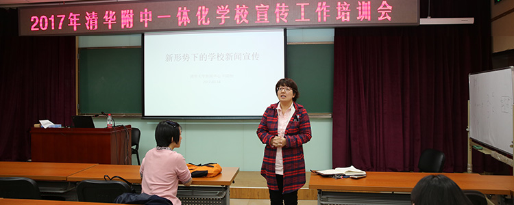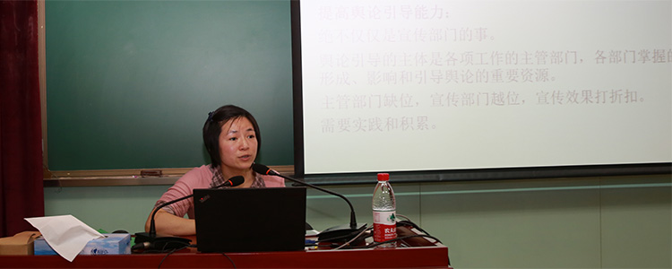 此次会议还特别邀请了清华大学新闻中心的刘蔚茹老师来做讲座。刘老师从为什么要重视新闻宣传和尊重新闻规律两个方面解说了新形势下的学校新闻宣传。