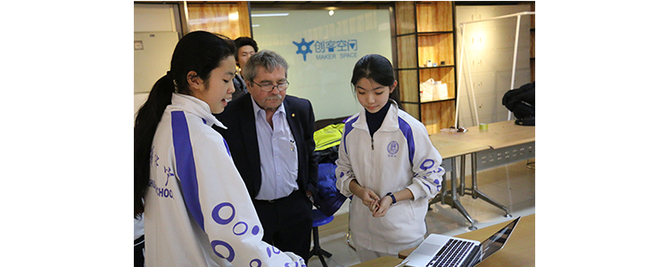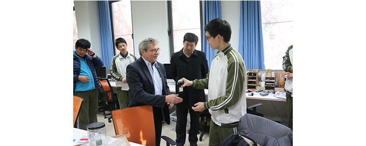 然后格奥尔格教授又来到澳门网上博彩创客空间与初中同学进行交流。澳门网上博彩创科中心建设于2013年,那时创客的概念还少有人知,在王殿军校长的支持下,学校在教室紧张的情况下为学生们开辟了200多平方米的空间,让学生们可以把设计变为产品,让梦想成为现实。目前创客空间已经发展成为具有丰富的师资、项目和设备的科技教育平台。