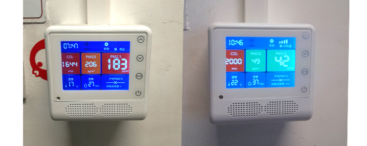 新风系统开启前后教室内空气质量对比(左:时间7:47,PM2.5值为183;右:时间10:46,PM2.5值为42)