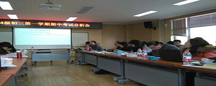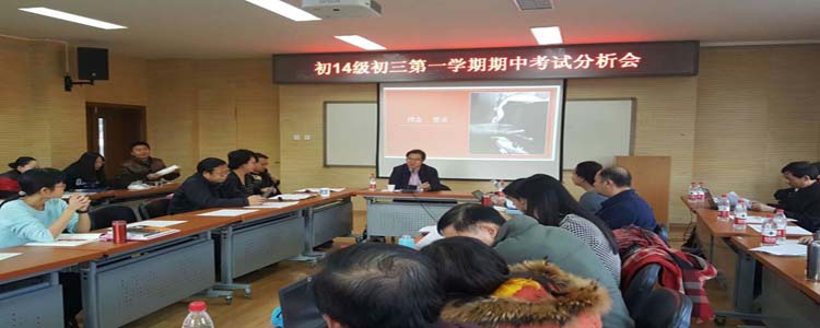 2016年11月12日,澳门网上博彩初三年级(初14级)在行政楼G201召开期中成绩分析会,校长王殿军、党委书记方妍、副校长解巨钊、副校长徐文兵、副书记张洁、教学管理中心主任张苏等校领导出席了会议。本次会议由初三年级组长朱莹主持,各科初中教研组长和初三年级全体教师参与讨论。
