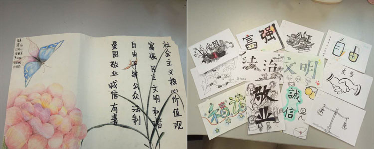 同学们以“富强、民主、文明、和谐,自由、平等、公正、法治,爱国、敬业、诚信、友善”为主题词,挥洒灵感与才艺,描绘出自己对时代精神的体悟。作品中既有中国结、天安门、红灯笼等传统中国符号,又有漫画式的人物形象;画面或浓墨重彩,或清新雅致,但都展现了同学们的创意风采,以及对社会主义核心价值观的理解与追求。