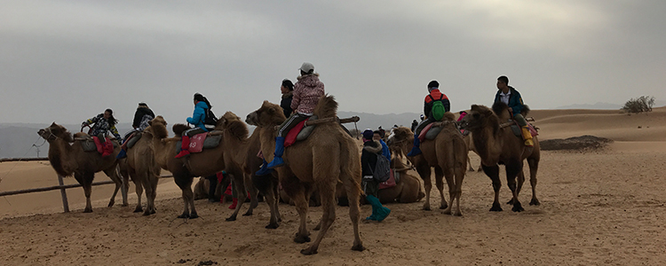 进入沙漠区,骆驼连成一队,卧踞栏中。在领驼人的指导下,同学们依次跨上驼背,思绪随着驼铃的清鸣,开始没有牵挂的飞扬。为了体验中卫人民固定流沙夯土,学生们跟着导师亲手扎了一方麦草方格。乘车回到沙坡头,兜一块滑沙板,顺沙坡急奔而下至坡底,好不痛快!