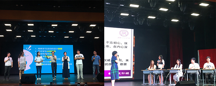 在教学技能展示环节,说课技巧组、教学设计组、多媒体技术组、板书设计组共同展示了新教师们的教学基本功。说课技巧组通过传统曲艺形式——群口相声的方式展示了说课的流程、重点和说课技巧,内容详实丰富,形式活泼生动。教学设计组通过模拟课堂《篱笆那边》形象地展示了教育教学过程中如何用别具匠心的课堂设计,让课堂富于启发性和趣味性。多媒体设计组的老师则通力合作,生动展示了如何综合运用多媒体教学方式激发学生学习兴趣、增强整体教学效果。板书技巧组通过情景剧的形式,展示了在多媒体教学盛行的背景下,传统板书教学所具有的在引领学生思考、激活课堂等方面的作用。