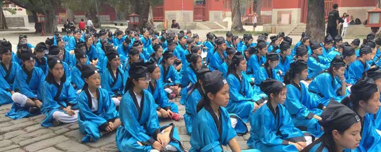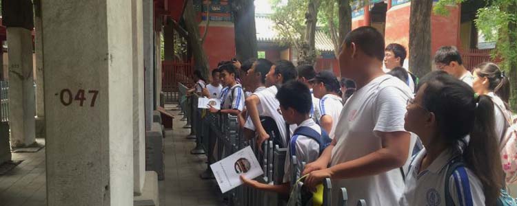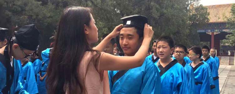 在国子监实践点,首先由各班班主任为初15级的孩子们依次行加冠礼,对每个孩子殷切叮嘱;之后同学们向孔子像和老师们行拜师礼,答谢师恩;接着,师生齐诵《论语》选段和《大学》选段,学习中华文学经典。而后,同学们集体观赏“大成礼乐”表演,体验中国古典礼乐文化内涵。下午,在导游的带领下,各班分组参观国子监、孔庙,对传统授业内容及儒家文化进行深入的了解。