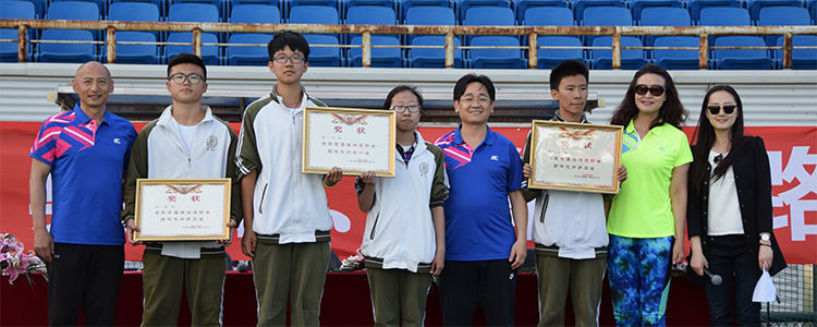 朱建宏校长(右4)、张姝敏副校长(右2)、陈卫东主任(左1)和王潇老师(右1)为获奖学生颁奖