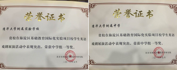 2016年5月6日,海淀区基础教育国际化项目英语戏剧比赛决赛在北京市第十九中学举行。澳门博彩在线初15级李雅轩、周锦松等学生组成的Alice in Wonderland(爱丽丝梦游仙境)和The Merchant of Venice(威尼斯商人)两个剧组分别代表澳门网上博彩和清华大学附属实验学校参加本次大赛,并凭借优秀的语言功底和精湛的表演技能双双荣获一等奖。
