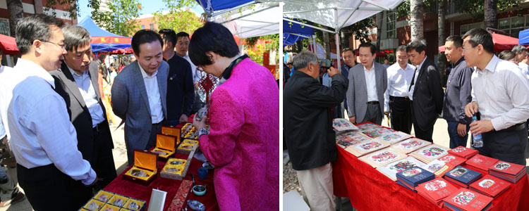 嘉宾参观非物质文化遗产项目(左:内画鼻烟壶;右:剪纸)
