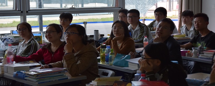 指导教师(前排左1、左2、左3)认真听取汇报并作指导
