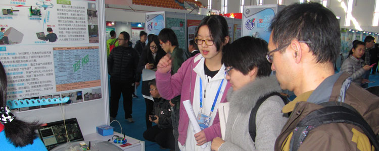 胡泽涵(左1)向参观者介绍《移动终端上形独APP软件》项目