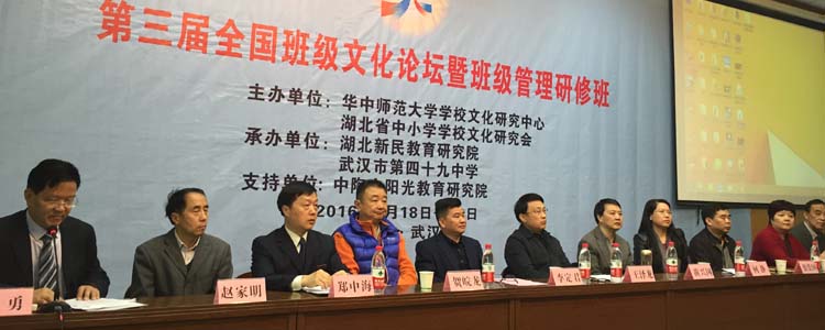 第三届全国班级文化论坛暨班级管理研修班由华中师范大学学校文化研究中心、湖北新民教育研究院主办,分为专家讲座、班级文化观摩、全国班级文化先进集体评选等环节,是全国优秀班主任及德育管理者交流、学习的平台,旨在提升德育工作者的核心素养。中国教育报湖北记者站、华中师范大学、湖北省学校文化研究会、湖北省教科院、武汉市青山区教育局相关领导以及来自北京、海南、广东、广西、贵州、江西、湖南、成都、西藏等全国10余个省市自治区的近400名代表参会。此外,武汉市第49中吕向东校长,武汉市功勋班主任49中高礼斌老师,北京师范大学贵阳附属中学校长沈连柱,武汉市十佳班主任、武汉市十五中教师刘亚珩,江西省师德标兵、南昌市十佳教师、南昌二中政教主任杨君红,武汉市百优班主任、武汉市十一初中雷云等,也分别作了演讲交流。