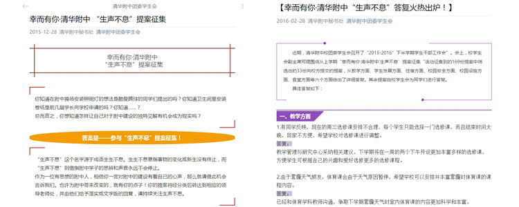 校团委微信公众号征集提案(左) 校团委微信公众号公布提案答复稿(右)
