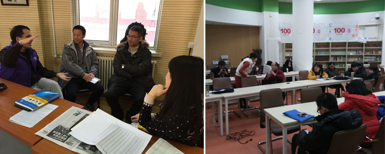 语体艺党支部分组讨论(左)政史地党支部党员进行讨论(右)