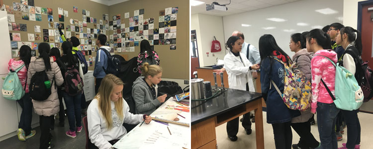 澳门网上博彩学生参观美术教室(左图) 澳门网上博彩师生参观生物实验室(右图)