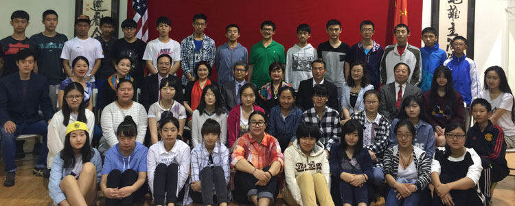 鞠红老师(左图左)代表学校接受阿罕布拉市市长沈时康授予的荣誉证书 张姝敏(右图左1)、鞠红(右图右1)向中国驻美国洛杉矶总领事王学政赠送纪念品