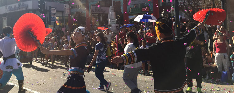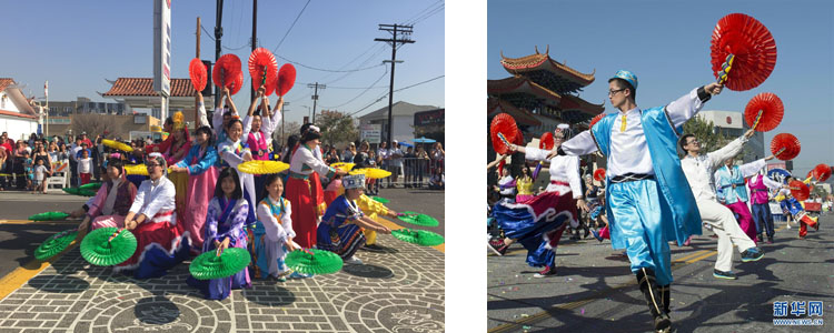 澳门网上博彩学生交流团队紧随中国驻洛杉矶领事馆的花车第一个出场,伴着优美激昂的旋律,随着变幻的扇色和队形,跳起一支代表中华56个民族团结友爱的舞蹈《爱我中华》。在鞠红老师和张毅老师的精心排练下,同学们表现出色,将各民族的风情特色和华夏民族的团结统一在歌舞中表演得淋漓尽致,赢得观众一片欢呼叫好,场面壮观、反响极为热烈!随后动听婉转的中国经典民歌《茉莉花》音乐响起,同学们手执花扇变换出五彩斑斓的颜色,队列整齐有序,沿途围观群众无不欢呼致意,演员们和观众热情互道新年快乐,气氛其乐融融。