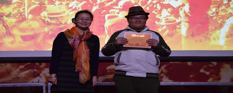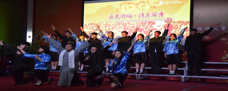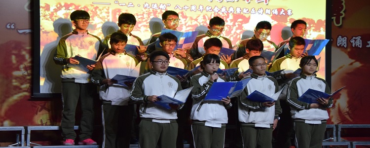 第二篇章“时代展望”中,由高1504班的同学们演绎《一二九的故事》。朗诵以短剧的形式呈现,场面慷慨激昂,还原了八十年前一二九运动的学生游行、与日本人抗争等场面。第五个节目的是高1502班,朗诵题目为《不能忘却的纪念》。学生现场古筝弹奏配合朗诵,跌宕起伏,引人入胜。第六个节目是由高1506班的带来的《铭记历史·相信未来》,《黄河大合唱》和朗诵配合完美。精彩的表演赢得了全体师生的阵阵掌声。