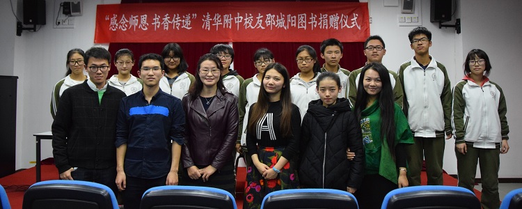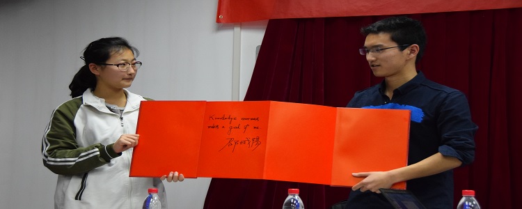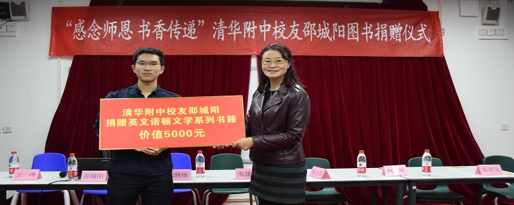 接着,邵城阳同学将捐赠的英文诺顿文学系列书籍捐书牌交至张姝敏副校长手中,并在校友分享册上用英文写下“knowledge enormous makes a god of me”的寄语感言。