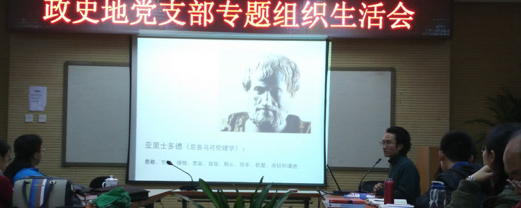 政史地(政治历史地理)党支部首先由4位青年教师分别从历史学、哲学、政治学、法学角度引导支部成员进行有关“纪律”的理论探讨,如“规矩”等汉语的历史源流、自由与秩序的哲学理解、亚里士多德的“廉政”思想以及“底线”对党员的独特意义。其次,支部成员之间进行了情景再现和答疑解惑:老师面对学生、家长“送红包,请客”的尴尬;学校领导会遇到的敏感情景及其应对策略;教师日常工作如调课、监考、课堂言行等纪律要求;校园服装的底线等。活动现场气氛热烈,党员活动积极性空前高涨。