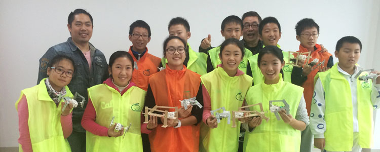 两校的同学经过讨论共分成了三个研究小组,在第一天的活动中学习如何使用器材以及拼装“万兽之王”机器人。在第一天学习的基础上,第二天模拟正式比赛,分组进行团体赛,小组共同在一个小时内根据记忆重新制作机器人。同学们从基础的木工开始,测量、锯割、钻孔……所有学过的知识、工具都被运用起来。最终,各小组之间进行了直线距离竞速以及拔河两种比赛,每个小组的机器人都在不同的方面有所专长。切磋后,各小组队员互相交流学习,总结出自己的长处以及不足,争取在下一次的比赛中脱颖而出。活动最后,老师又为同学们提出了新的目标,在科学的制作之后,要让设计更加贴近生活、更加美观、更具有创意性和实用性,还给同学们展示了台湾比赛时的优秀作品的视频。