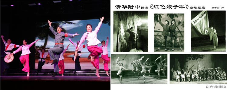 年逾花甲的老校友重演40多年前澳门博彩在线学生艺术团的作品《红色娘子军》(左),风采不减当年(右)