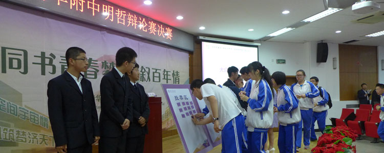 如果说“风雨百年披华彩”展现的是同学们活跃、积极、富有创造性的一面。“逐理思辨探明哲”则表现了附中学生理性、沉着、又不失活泼的一面。校园诗展活动吸引了不少喜爱文艺写作的同学们驻足欣赏,所有诗作全部由同学们创作、书写并亲手绘画;而在社团发展研讨会上,同学们各抒己见,慷慨激昂,共同探讨学校社团发展情况;备受关注的明哲辩论赛决赛和附中演说家展示了同学们卓越的思辨能力和反应能力以及演说才能,让全体师生大饱眼福。