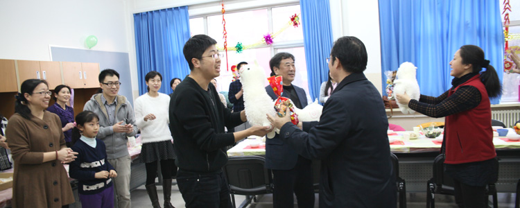 学校党政领导依次到各会场向全体教职工拜年,并为教职工送去毛绒羊玩具和糖果