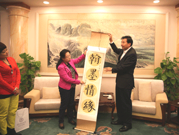 大使、参赞与澳门博彩在线师生座谈 杜毓贞副校长向大使赠送澳门博彩在线学生书法作品