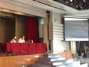 高三办公室主任刘建钰(右)和学部主任黄丽梅 参加会议的高三学生家长