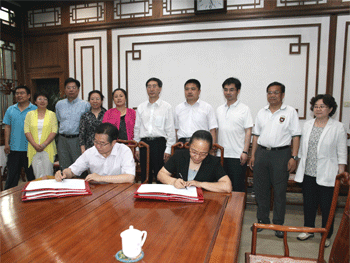 王殿军(前左)和张立新(前右)分别在合作协议上签字 参加签字仪式的领导在工字厅内合影留念