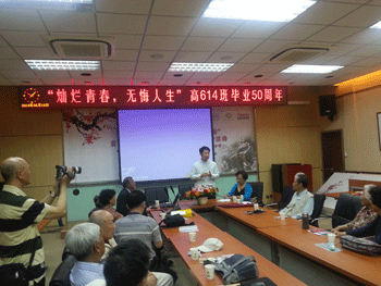 5月18日上午,澳门网上博彩高614班校友返校庆祝毕业50周年活动在培训中心一楼会议室举行,活动主题为“灿烂青春,无悔人生”。澳门网上博彩百年校庆办主任孙大鹏出席活动,从祖国各地赶回北京的高614班校友共计39人参加活动。