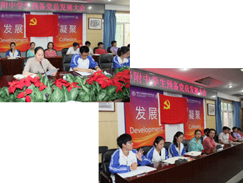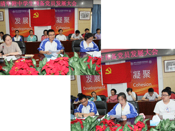 王友潮(左上前中)赵芯培(右下前中)分别宣读《入党申请报告》 入党介绍人(左上)、学生积极分子(右下)发言