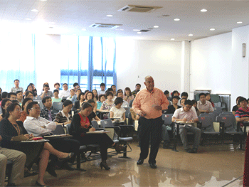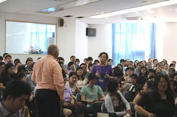 保罗凯莫博士以“老师教什么,老师如何教,哪个更重要?”的提问开始了本场讲座。首先,解答了讨论式教学的两个难点问题,一是如何利用课堂宝贵的时间,二是如何创设课堂讨论环境。其次,讲到了提问的艺术,强调教师要引导学生朝期待的方向去思考,并走出教师自己的“舒适地带”。最后,保罗博士依据在托马斯杰佛逊科技高中和人大附中的教学经验,讲解了如何整合教学风格和学生行为,从而提高教学效率的方式与技巧。整个讲座过程,保罗凯莫幽默诙谐,不断与教师互动并解答老师提出的问题。