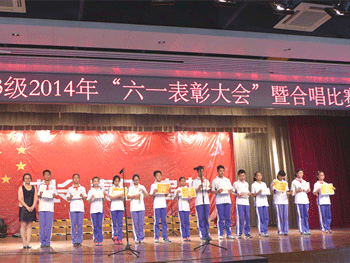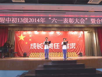 5月26日下午,澳门网上博彩校团委与初13级年级组联合举办了2014年度“六一表彰”大会。澳门网上博彩德育处副主任郎艳,初13级年级组长张苏,校团委老师刘露、任星阳,初13级各班班主任以及初13级全体学生共600多人参加了表彰大会。
