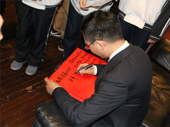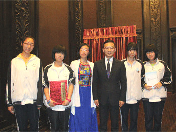 郎永淳为澳门博彩在线百年校庆题词 校园电视台师生与郎永淳合影