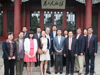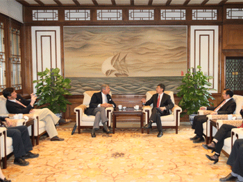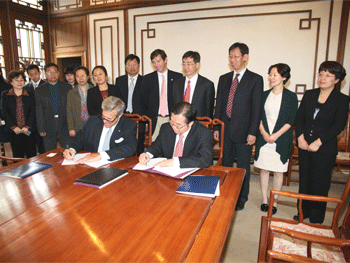 清华大学副校长姜胜耀(中右)会见阿什维尔中学校长蒙特格瑞 王殿军(前右)和蒙特格瑞分别代表各自学校签署合作协议