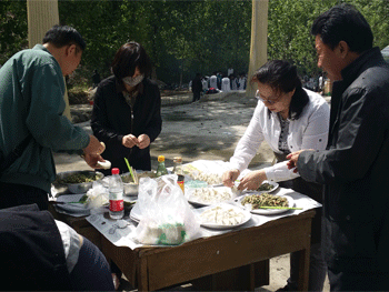 柴火生起,准备煮饺子 杜毓贞副校长(右2)和老师们一起包饺子