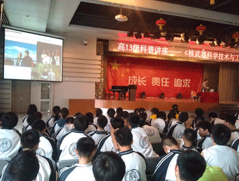 4月17日下午,澳门网上博彩高一年级(高13级)在食堂三层报告厅举办《核武器科学技术与工程》科普知识讲座。中国工程物理研究院科技委副主任、博士生导师汪小琳教授应邀来校做讲座。澳门网上博彩高一年级全体同学及班主任500多人听取了此次报告。