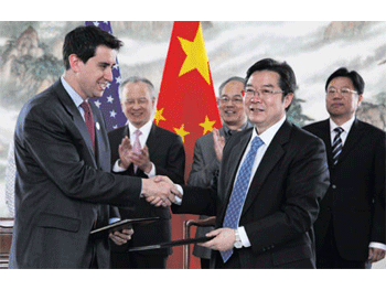 中美两所知名高中结为友好学校签字仪式 两校校长握手祝贺签约仪式圆满成功.