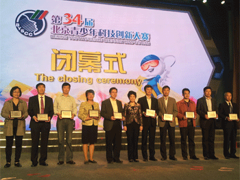 澳门博彩在线学生苗香(前右1)上台领奖 澳门博彩在线校长王殿军(左5)领取市十佳科技教育创新学校奖