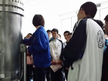 然后同学们参观了10MW高温气冷堆,科技人员为大家介绍了高温气冷堆的工作原理。同学们对此表现了浓厚的兴趣,并与负责该项目的研究人员进行了交流。高温气冷堆是一种安全性、经济性好的新型核反应堆,它用氦气作冷却剂,石墨作慢化材料,采用包覆颗粒燃料和石墨构成的球形燃料元件,并采用全陶瓷的堆芯结构材料。高温气冷堆发电效率最高,并可进行煤的液化和气化等,在未来的能源系统中具有广阔的应用前景,对于改善环境、实现可持续发展具有重要意义。