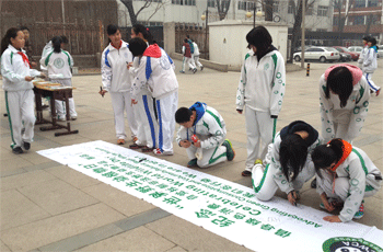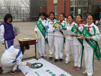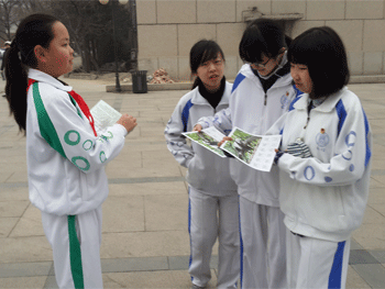 项目组同学发放宣传单 创新班保护野生动植物项目组成员合影