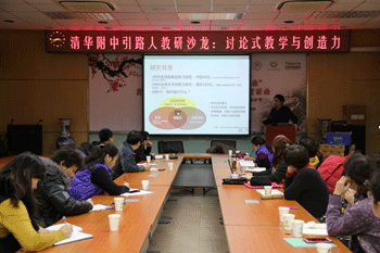 清华大学工业工程系教授、人因与工效学研究所所长饶培伦应邀做题为“运用讨论式教学提升创造力的实践经验”的报告。他首先介绍了自己在“运用讨论式教学提升学生创造力”课题的研究背景、研究方法、研究过程和研究成果,通过实践来说明讨论式教学对提升学生创造力的作用和影响。随后,饶培伦教授与大家展开互动交流。教研组长就自己在课堂上讨论时遇到的问题踊跃发言,饶教授幽默、机智的回答,让大家感觉受益颇丰。