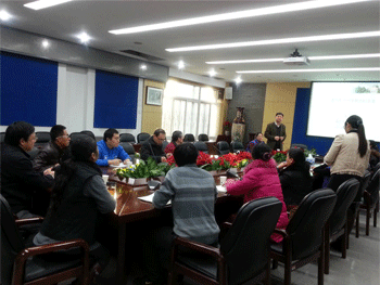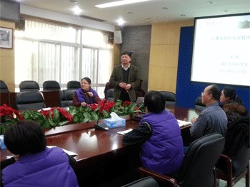 张希院士(立者)在做报告 张希院士(立者正面)和老师们亲切交谈
